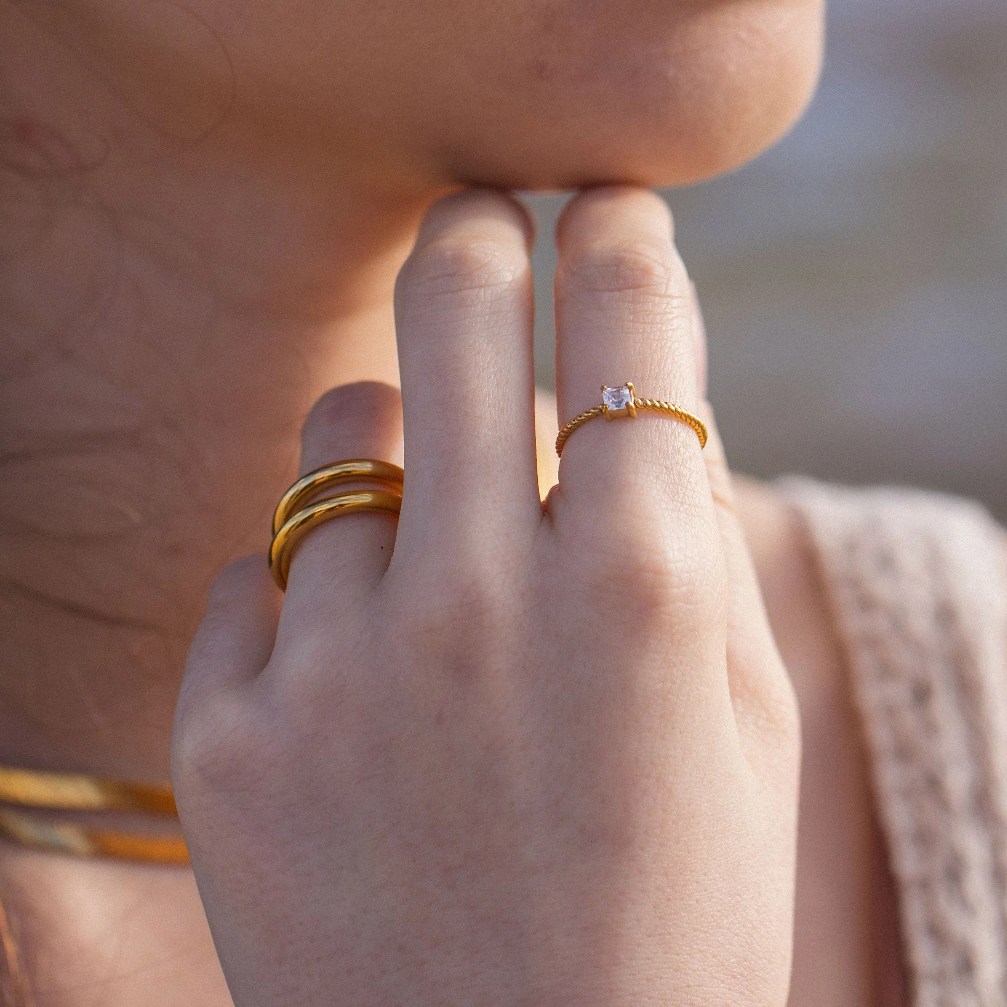 La fascia ad anello intrecciata con la pietra preziosa rende questo gioiello delicato.