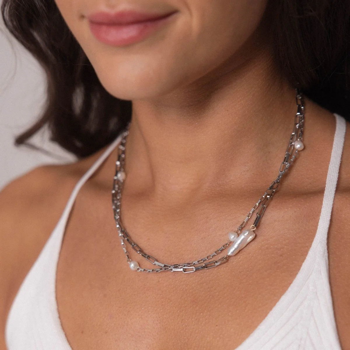 Il design di questa collana gioca con un mix entusiasmante di catene e perle. Sentiti come una sirena quando salti in acqua con lacollana Kapakai!